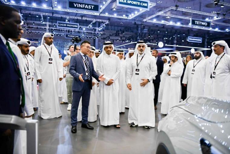 图为卡塔尔总理率团亲临奇瑞展区,盛赞首发车型星途星纪元ES